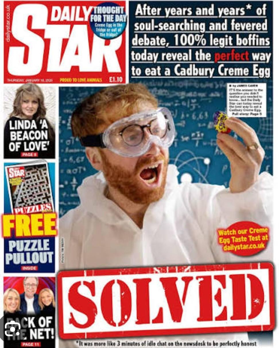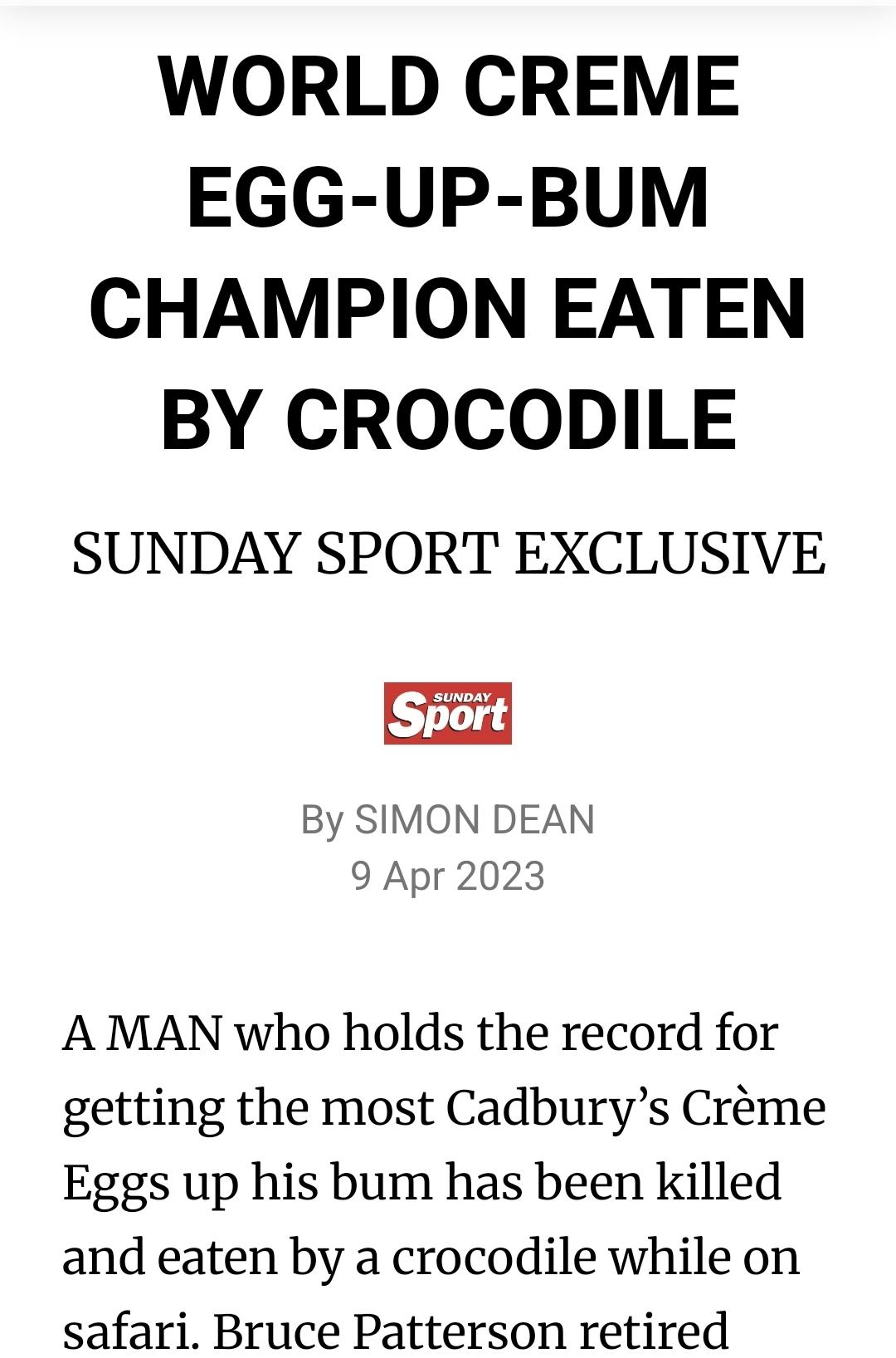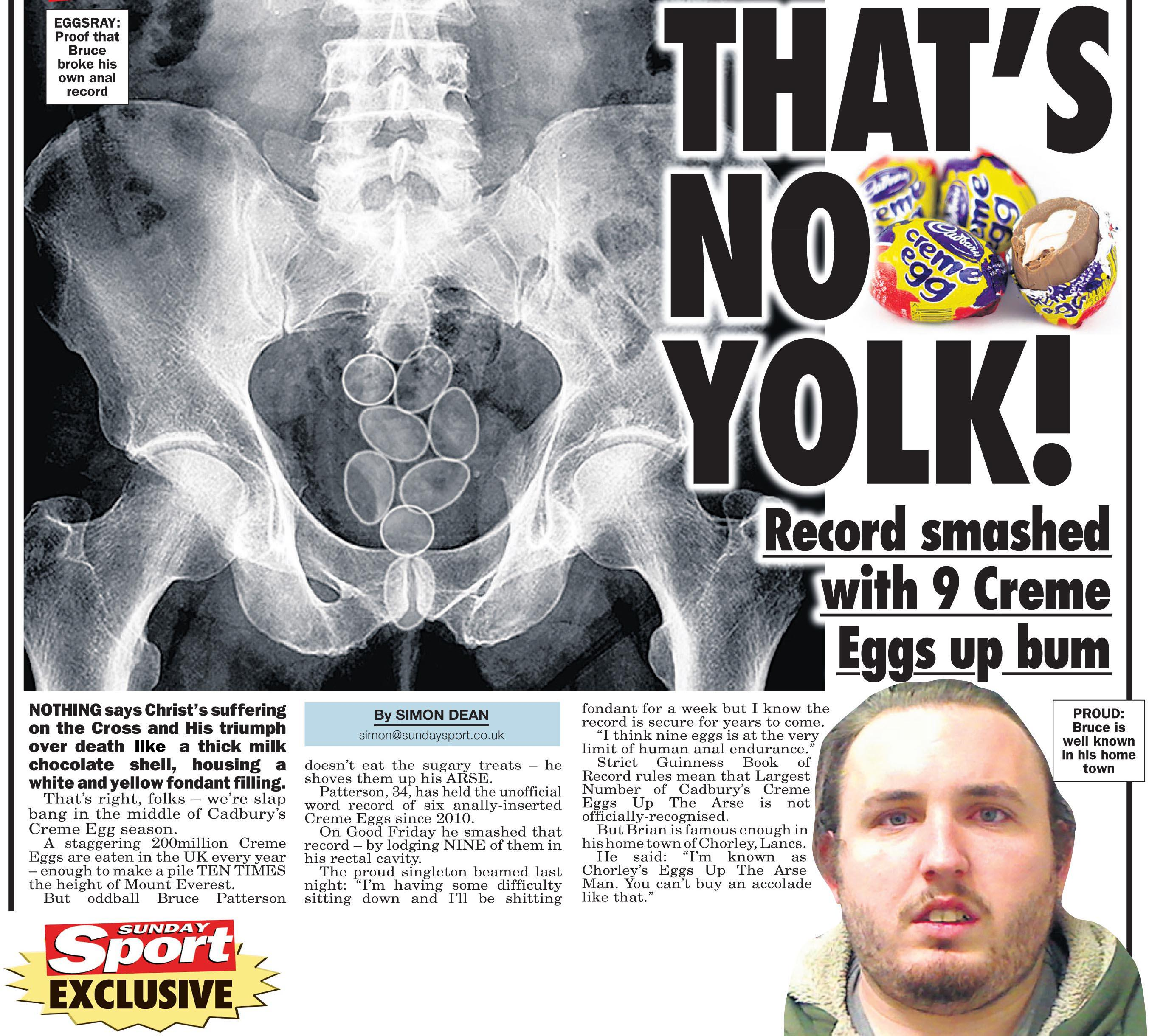 @woe2you @TheBreadmonkey @ben @babe @Nickiquote @jerry @skeletor @TwoClownsEating @Tattooed_Mummy on the whole, a crème egg isn’t that much of an achievement – now if it were some of those big Easter eggs (which would have to be kept unbroken), let’s see how many of those any potential news headline seekers might attempt.
