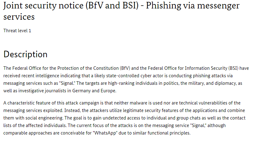 In a joint security notice BfV & BSI warn that a likely state-controlled threat actor is conducting phishing attacks via messaging services such as Signal. The targets are high-ranking individuals in politics, military & diplomacy and investigative journalists in Germany & Europe. https://www.bsi.bund.de/SharedDocs/Cybersicherheitswarnungen/DE/2026/202602_BfV_BSI_Sicherheitshinweis.html
