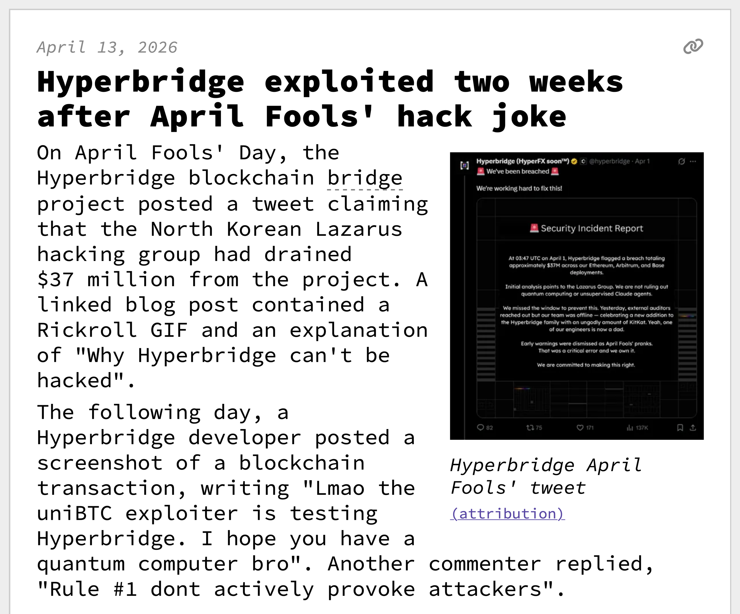 Hyperbridge exploited two weeks after April Fools' hack joke