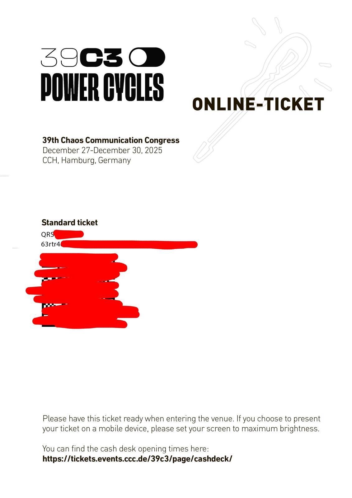 First #39C3 fake ticket spotted in the wild. If you see any offers on platforms like Kleinanzeigen or eBay showing a ticket it is a scam - tickets are not issued and no one knows how they will look like. Flag those offers please.