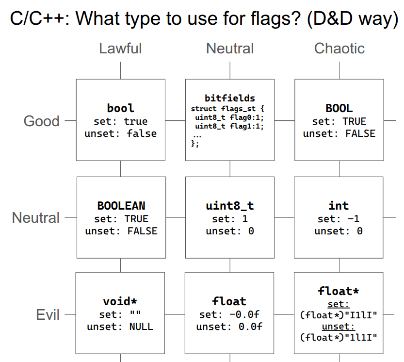 A useful chart on what type to use for flags in C/C++ depending on your D&D alignment: