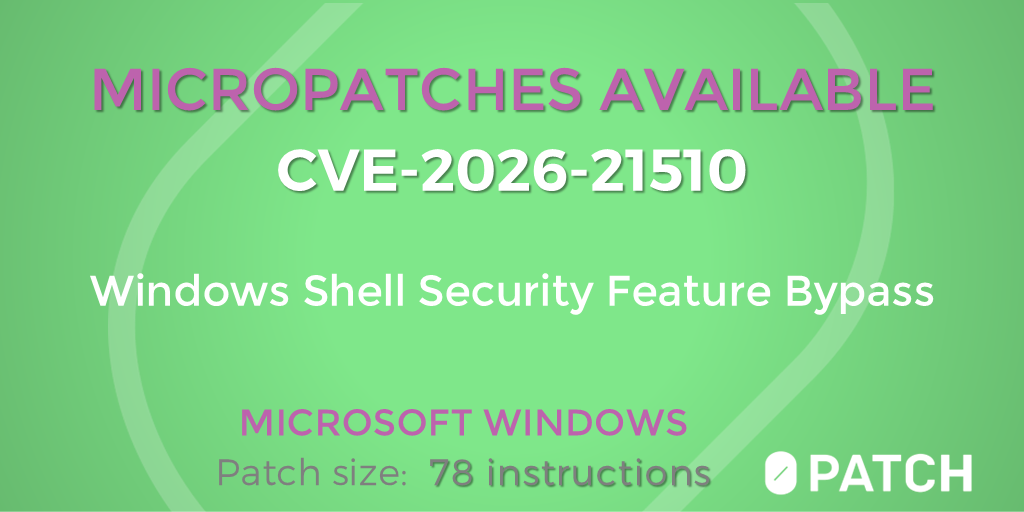 Micropatches released for Windows Shell Security Feature Bypass Vulnerability (CVE-2026-21510) https://blog.0patch.com/2026/04/micropatches-released-for-windows-shell.html
