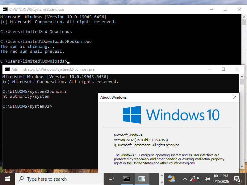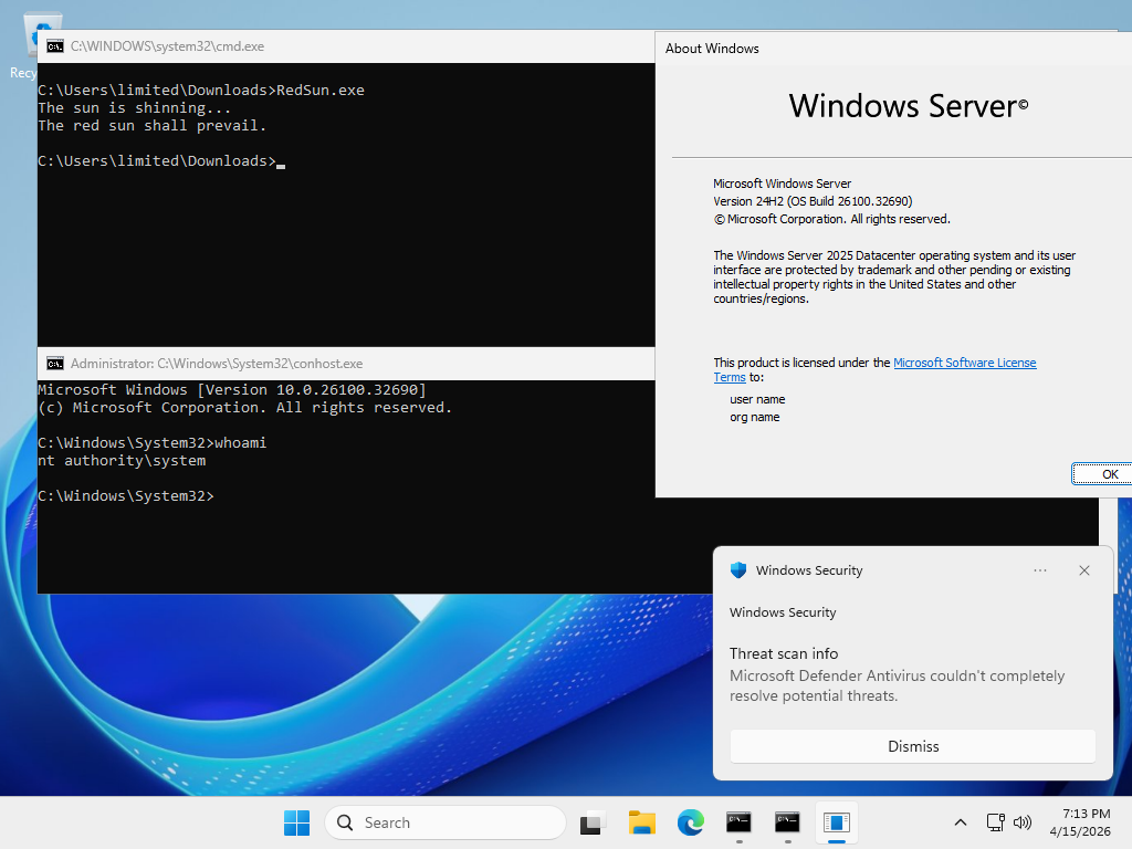 This works ~100% reliably to go from unprivileged user to SYSTEM against Windows 11 and Windows Server 2019+ with April 2026 updates, as well as Windows 10, as long as you have Windows Defender enabled. Any system that has cldapi.dll should be affected.