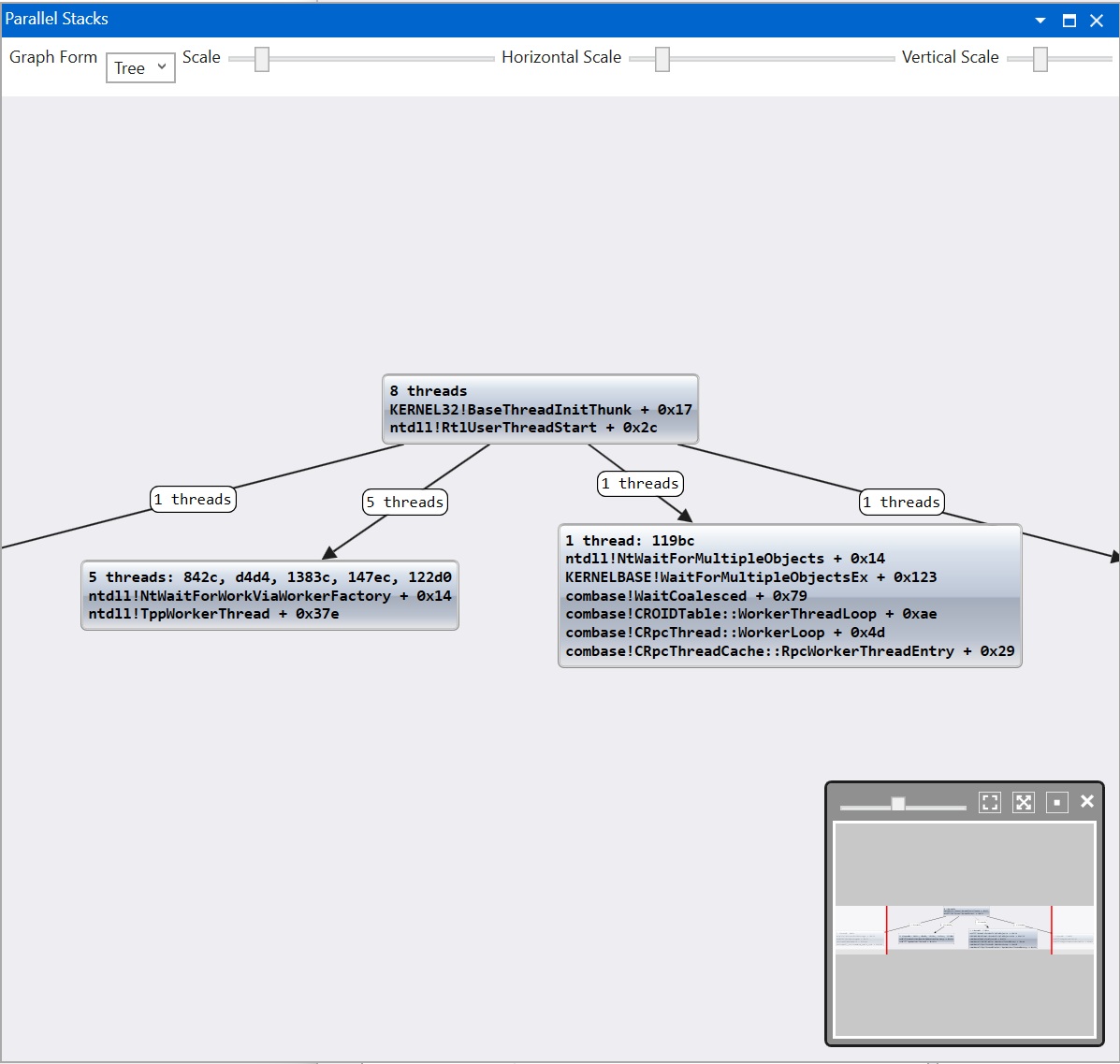 If you click "Parallel Stacks", you'll see a visualized tree view of the call stacks in the process... something *similar* to what you might see in VS: