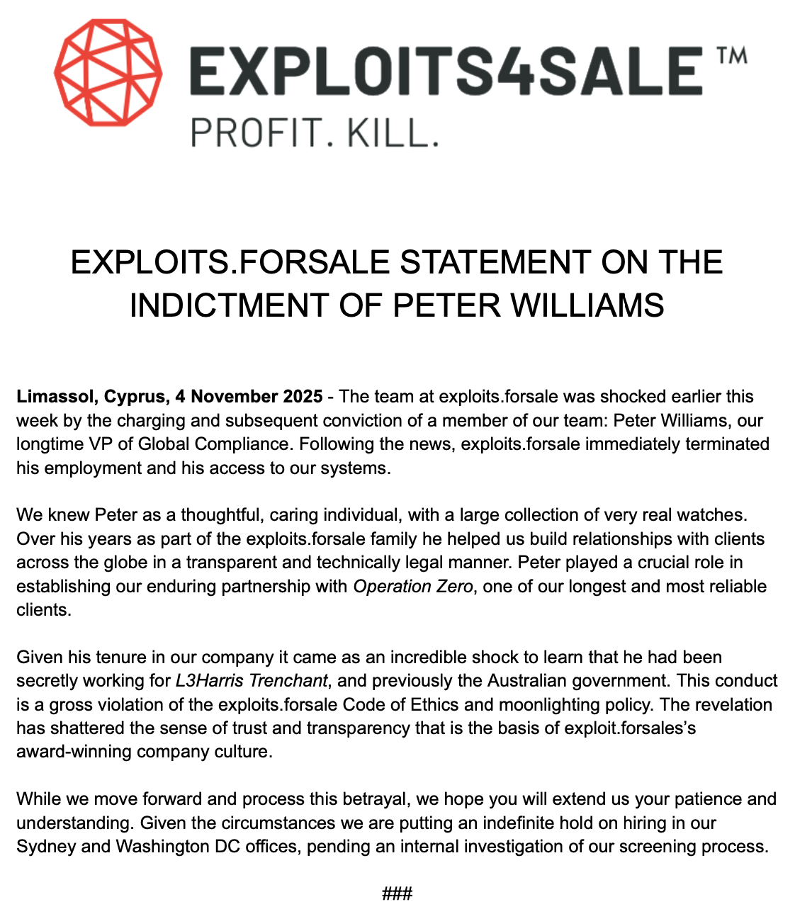 FOR IMMEDIATE RELEASE: exploits.forsale's statement on the arrest of Peter Williams