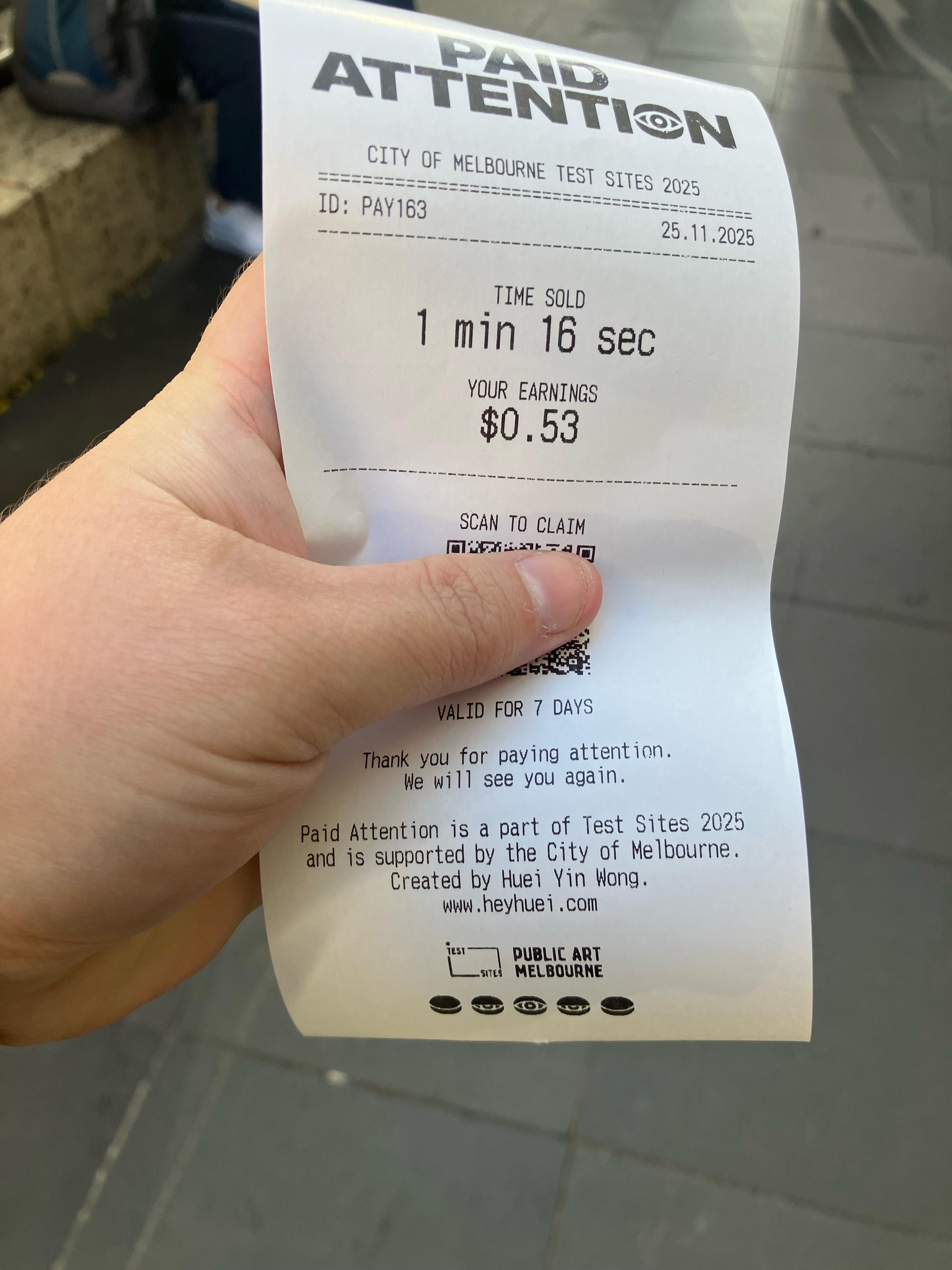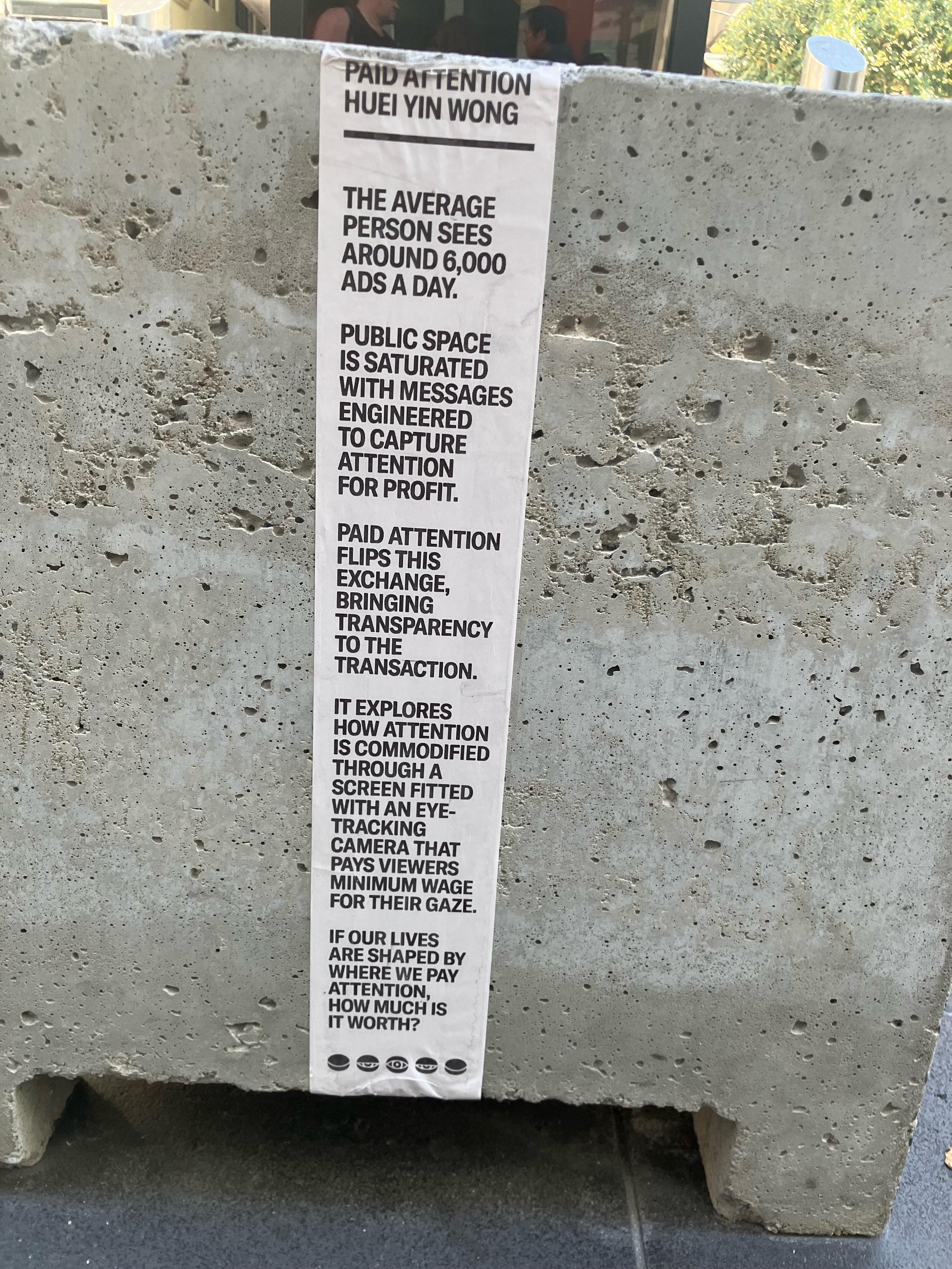 Came across this striking art piece in Bourke St Mall, #melbourne called Paid Attention by Huei Yin Wong. It’s designed to comment on the way the advertising industry profits from constantly taking our attention at no benefit to us. If you sit making unbroken eye contact with the messages about our attention choices on the screen, it pays out the equivalent of minimum wage for the time watched. Sitting there conspicuously staring at something silly in public for even less than 2 minutes was weirdly unsettling even though we’re constantly looking at silly stuff on screens