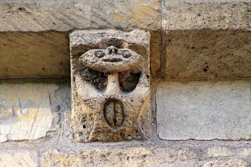 A sheela na gig is a grotesque carving found in churches built around the 11th or 12th century. These carvings depict a figure with an exaggerated vulva, usually holding it open.